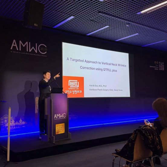 近日,在全球医美领域最具影响力的学术盛会之一——AMWC 2026世界美容抗衰大会现场,韩国微整形学会会长高益秀教授受邀进行专题授课,系统发布针对Vertical Neck Wrinkle(纵向颈纹)的结构化矫正方案。