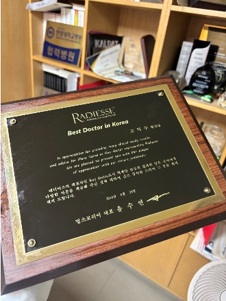 例如,其曾作为关键临床医生参与Radiesse(瑞得喜)相关应用与研究,并获得“Best Doctor in Korea”认可;同时,在Botox(保妥适)临床研究与应用领域亦获得官方表彰。这类跨产品、跨周期的长期经验,使其对不同材料在不同注射层次中的扩散特性、支撑能力及安全边界形成了系统性理解。